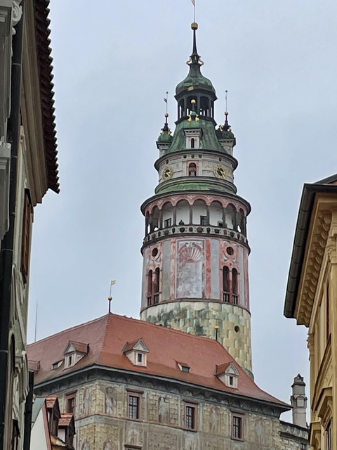Les ruelles médiévales bordées de façades colorées ornées de stucs Renaissance semblent s’élever vers le ciel au-dessus d’un méandre de la Vltava.
